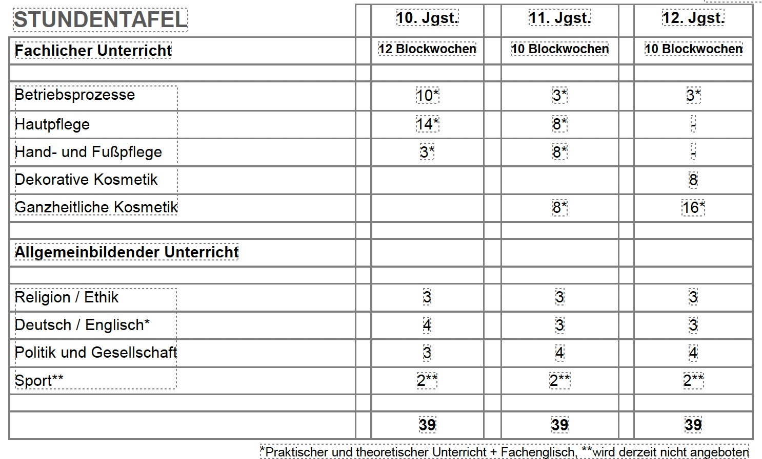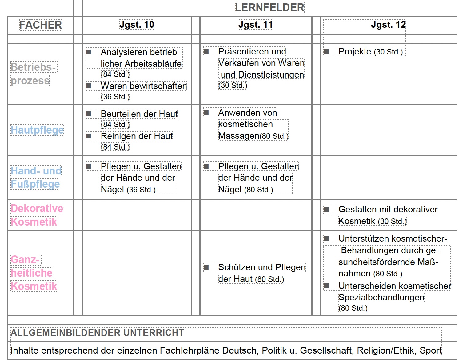 Überblick der Fächer und Lernfelder